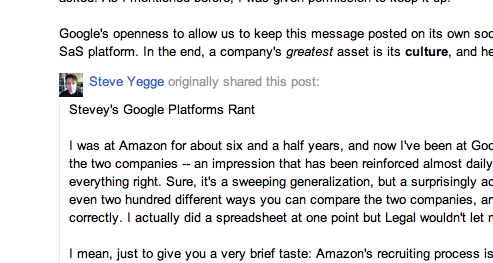 Anyhow, I’d recommend reading the whole thing as much for its description of Google as for its comparison with Amazon. For example,