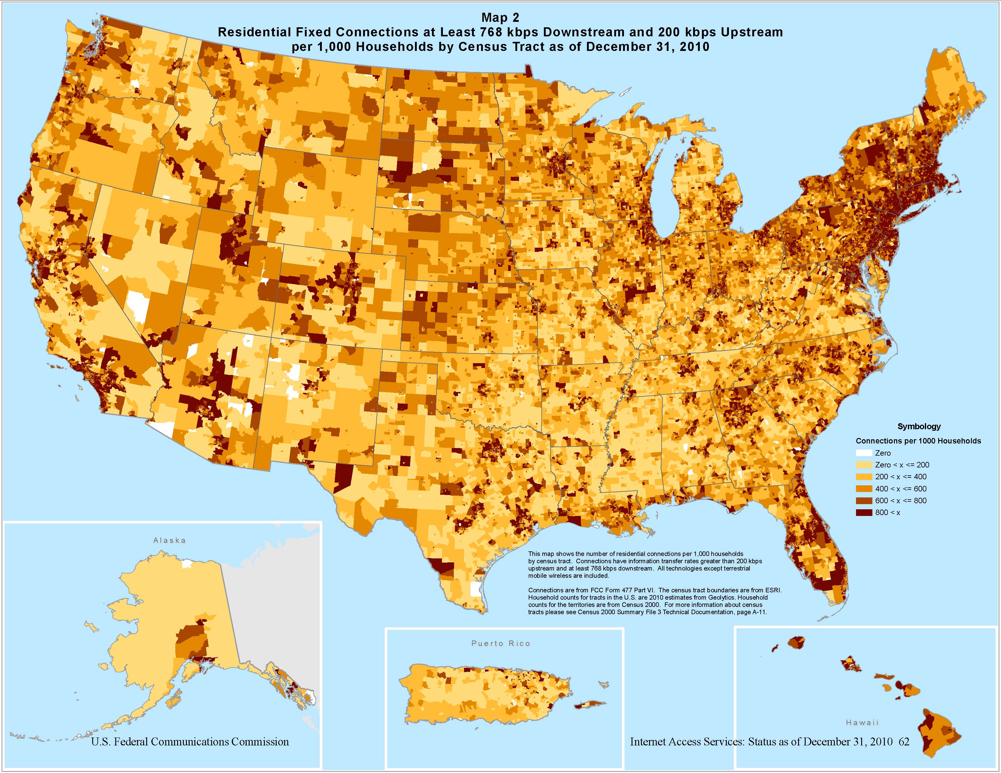 Let’s start with the map. It shows the distribution of broadband lines per capita at the census tract, where a line must exceed 765 kbps download and 200 kbps upload.