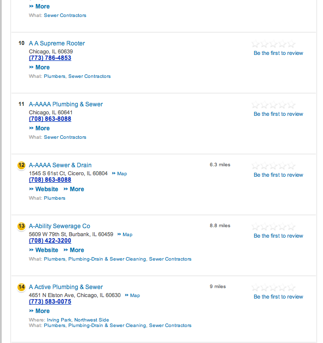 Apparently, this same strategy is used quite often. Choosing a name to get ahead in the Yellow Pages. Ryan McDevitt of the Simon School of Management at the University of Rochester has studied this behaviour. In Chicago, plumbers who begin with the letter ‘A’ are 5 times more likely to receive complaints at the Better Business Bureau than others. This is a large market phenomenon and it apparently pays off as they get higher prices too.