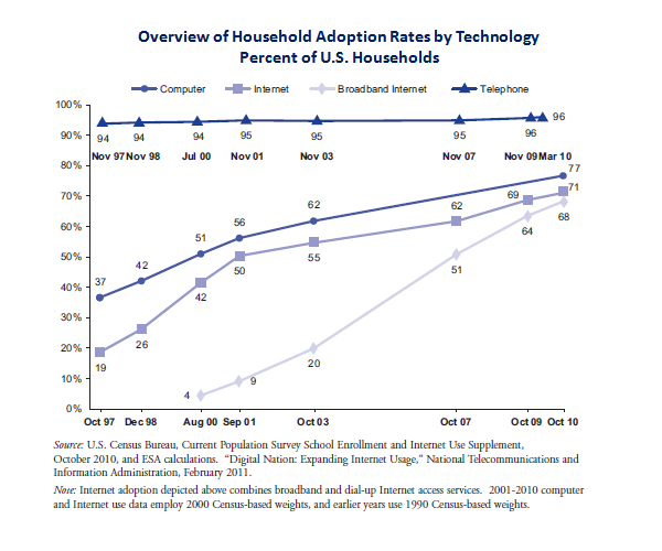 2. I am having a tough time understanding why it is bad news that we have so many non-adopters in the “Don’t Need It” and “No Computer/Computer Inadequate” groups. I can understand it if this is simply bad news from the criterion that we want full adoption (although a disproportionate amount of the non-adopters are over 65 years old so their deaths will increase adoption), but I don’t see why having less than full adoption is a bad.