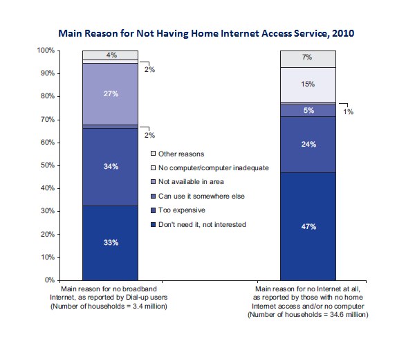Which gets us to the second picture. It shows the results of surveys of non-broadband users. It asks those users to explain why they do not have Internet access at home. Once again, there is good news and bad news in the diagram.
