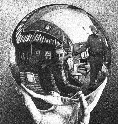 Consider this combination with an iconic MC Escher drawing. It gives the pepper spray a different meaning, a more contemplative one. Placing pepper spray inside the reflective mirror twists the meaning. What does the artist mean to suggest?