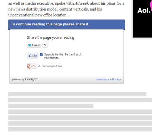 From Katherine St Asaph, an observation that AdWeek have set up what she calls a ‘trollwall’ for some articles (see her screenshot to the left). The idea is that you can read the full article if you share it.