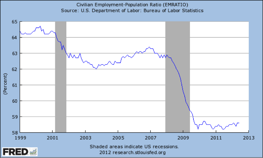 Tom Edsall does a nice job summarizing the increasing hollowing out of the job market in his New York Times column today. The employment/population ratio has fallen drastically since 1999 even as Real GDP hit an all time high this month. Edsall quotes Andy McAfee and me arguing that technological progress is part of the story for both these trends. Fewer people are working in America today than in the late 1990s, even though overall income is higher.
