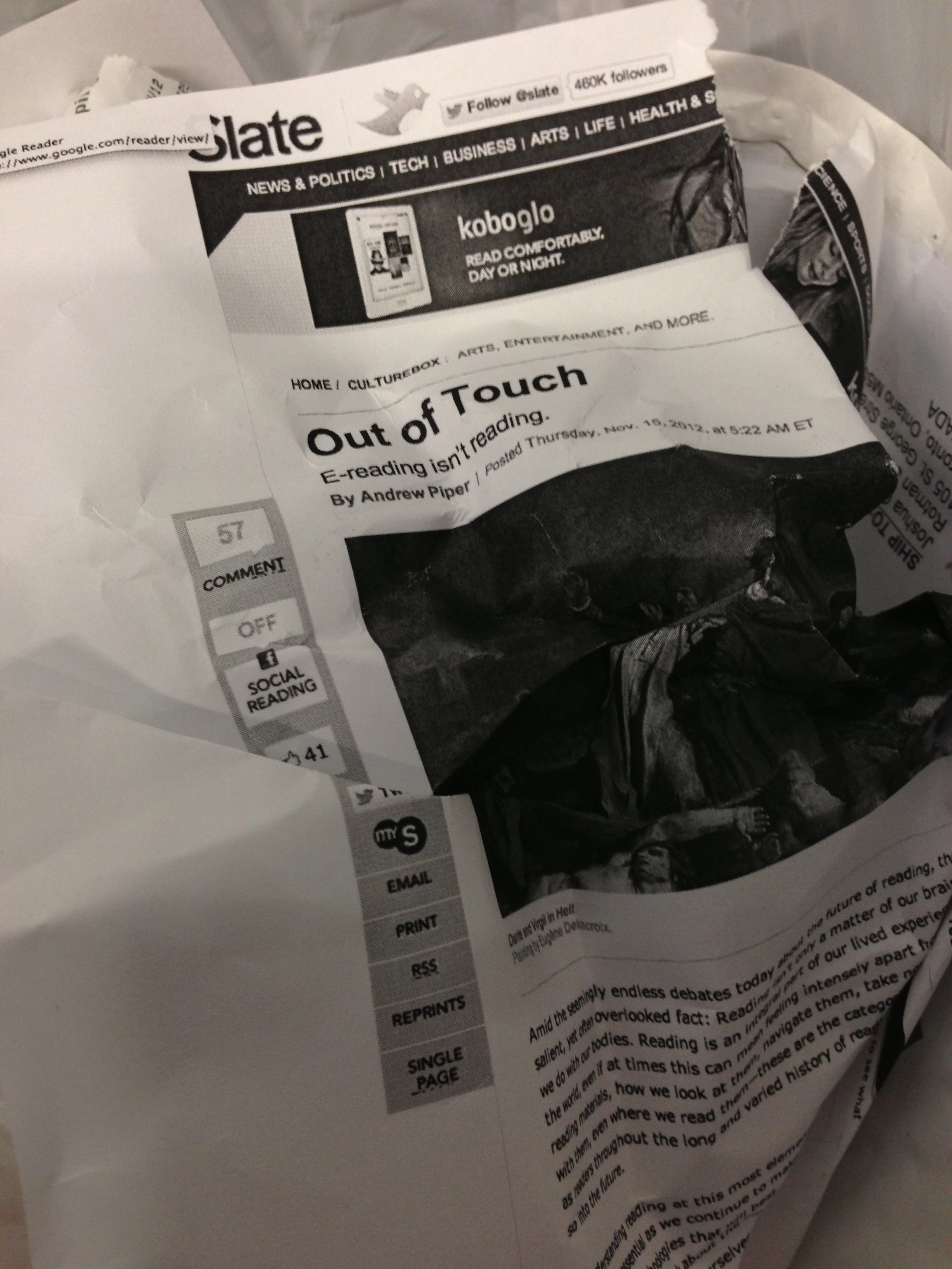 That would be Andrew Piper whose book, Book Was There: Reading in Electronic Times, was excerpted in Slate today. Actually I wouldn’t recommend reading it. So let me save you the trouble by commenting on it.