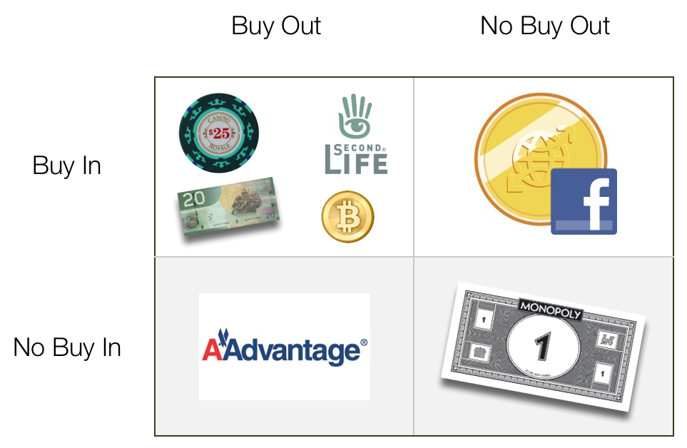 The classifications depended upon whether you could exchange the currency for dollars (no for monopoly money although my children did expand the money supply using another set and yes for casino chips) or whether you could use dollars to buy in to the currency (no, for frequent flyer programs — typically at least — and yes, for the Canadian dollar). When you look at it this way, Bitcoin has more in common with computer chips than Farmville credits. But it is also not unprecedented.