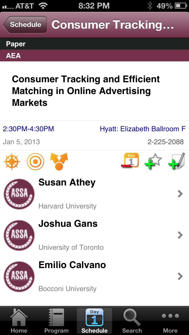 The second feature was the ability to build your own schedule. Find a session you want and you can add it to your calendar. You can even add multiple sessions for the same time in case you want to schedule based on individual papers rather than sessions. Moreover, it was intuitively designed. It was very easy to see functions and use them. For instance, you could share session information on social media and you only had to press one button to find out where the session was on a map.
