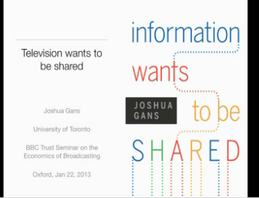 The video stream from the BBC Seminar on the Economics of Broadcasting that I discussed a few weeks ago is now up. You can access it here. My talk is the third on the list and it is entitled (this will surprise no one), Television Wants to be Shared. There are lots of interesting talks there, however, for those interested in the economics of public broadcasting.