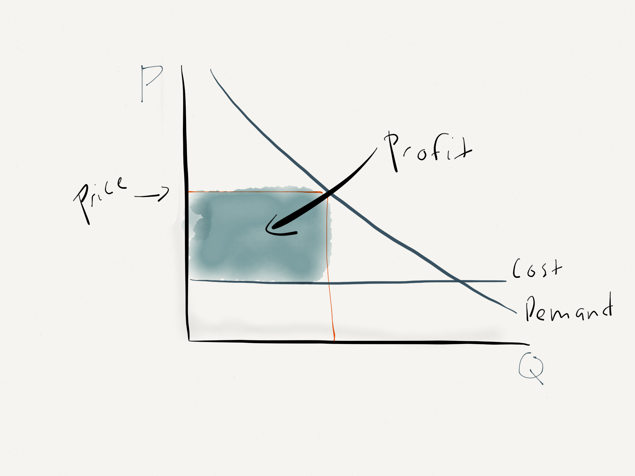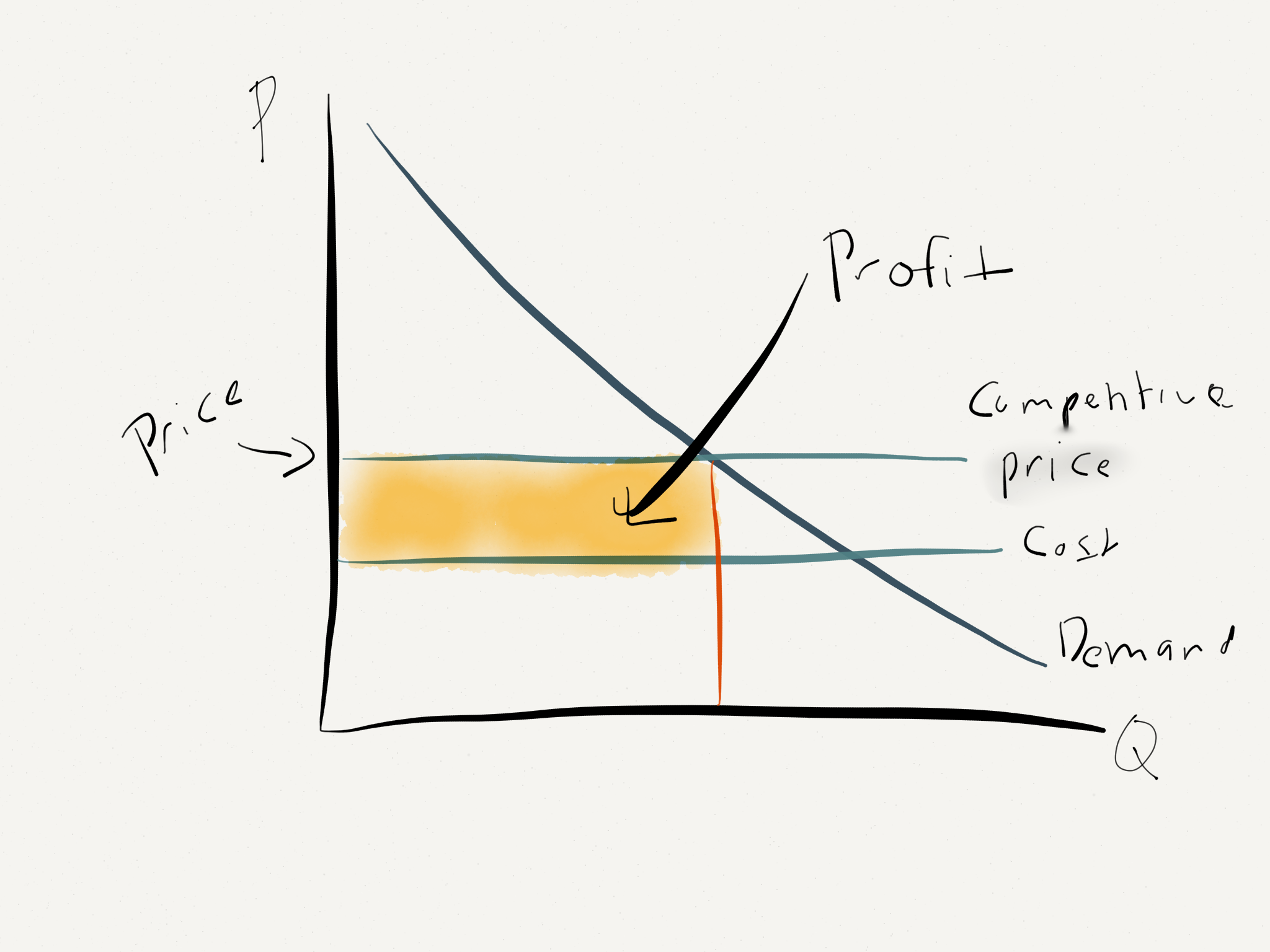 There is, however, another sort of monopoly — a path that gets you 100 percent of a real market. This is done by having the capabilities to beat all rivals on either quality or cost. To see how this arises consider a very structurally price competitive market (in economics, Bertrand competition). Now suppose that you develop an innovation that allows to have lower marginal costs than everyone else. In this situation, you will be able to capture 100 percent of the market and so you will be a technical monopoly. The difference is that you pricing is constrained by potential competition from other firms. In other words, your monopoly profits look like this:
