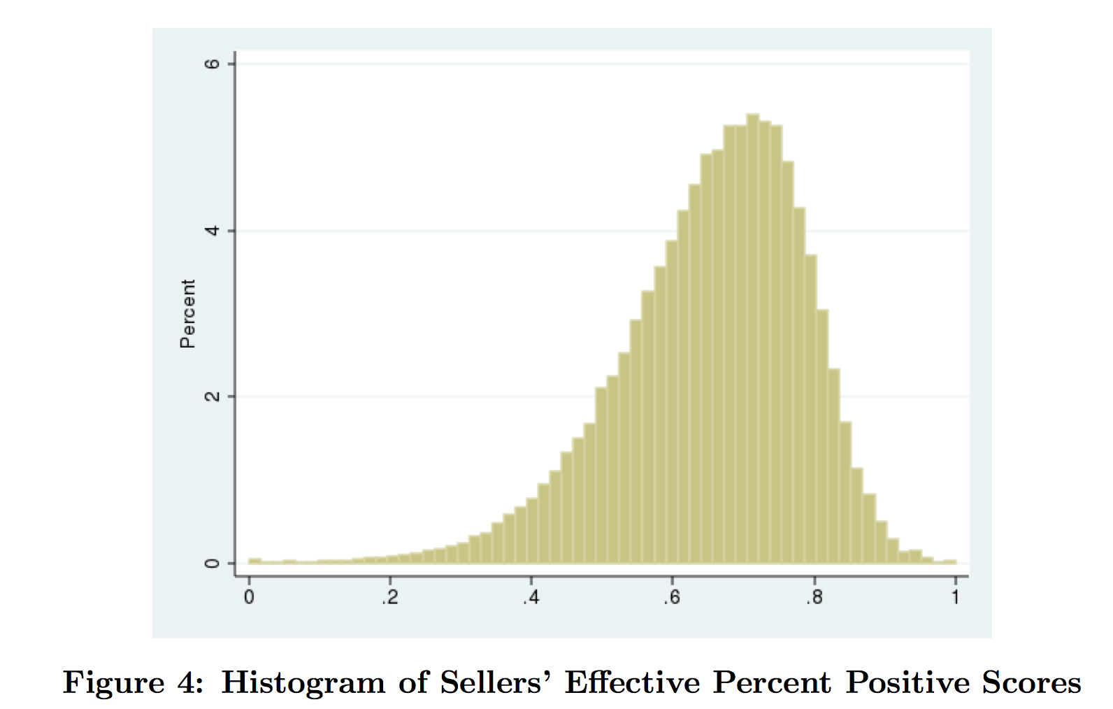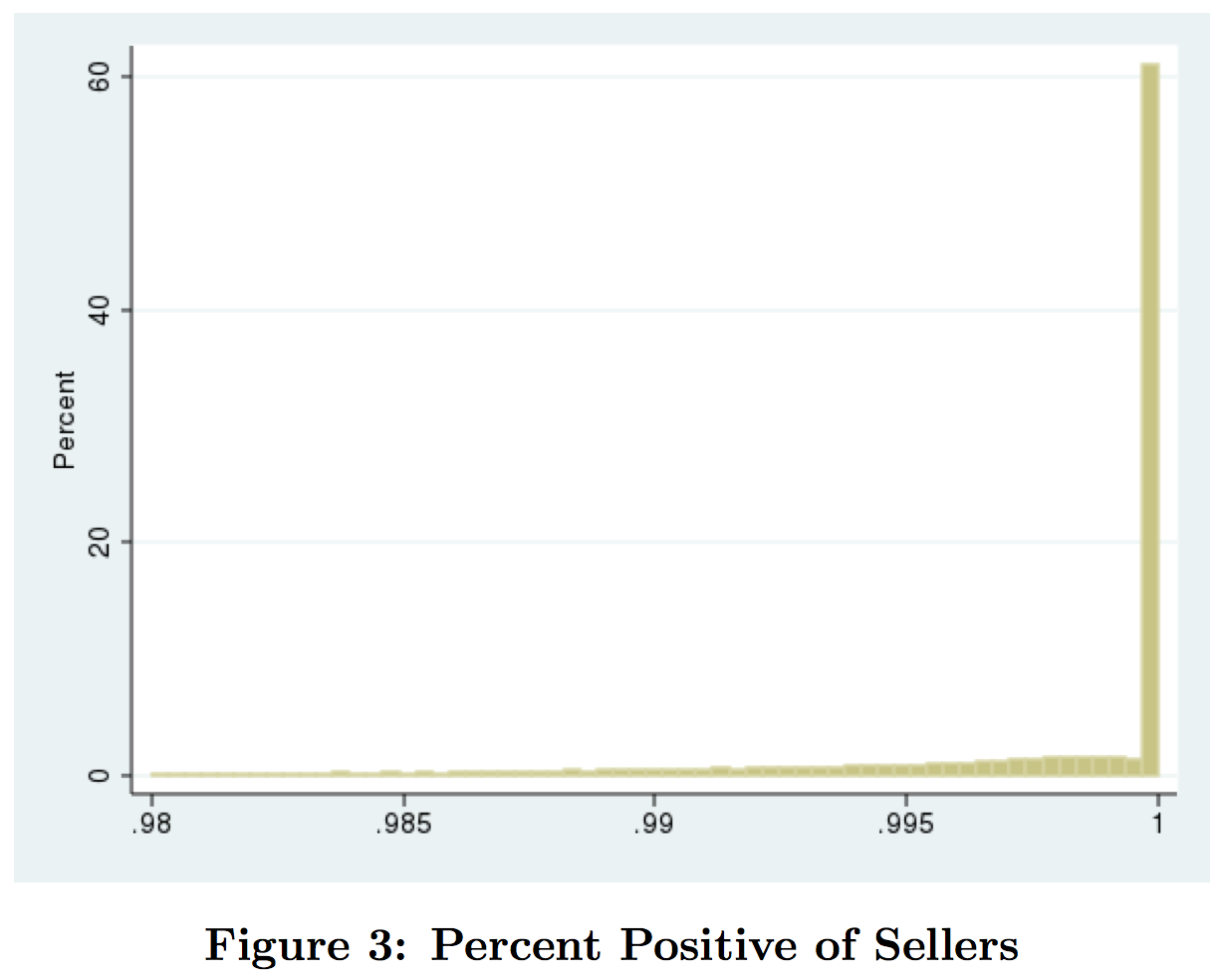 To be sure, this graph already starts at the 98th percentile! Suffice it to say, if all sellers are positive on ebay, showing us the percent positive for each seller is not going to do much in the way of sorting. Of course, the problem is that, if the reputation mechanism worked perfectly, we would see the same thing. No one would buy from anyone who didn’t happen to have a perfect rating and so no other sellers could be in business.