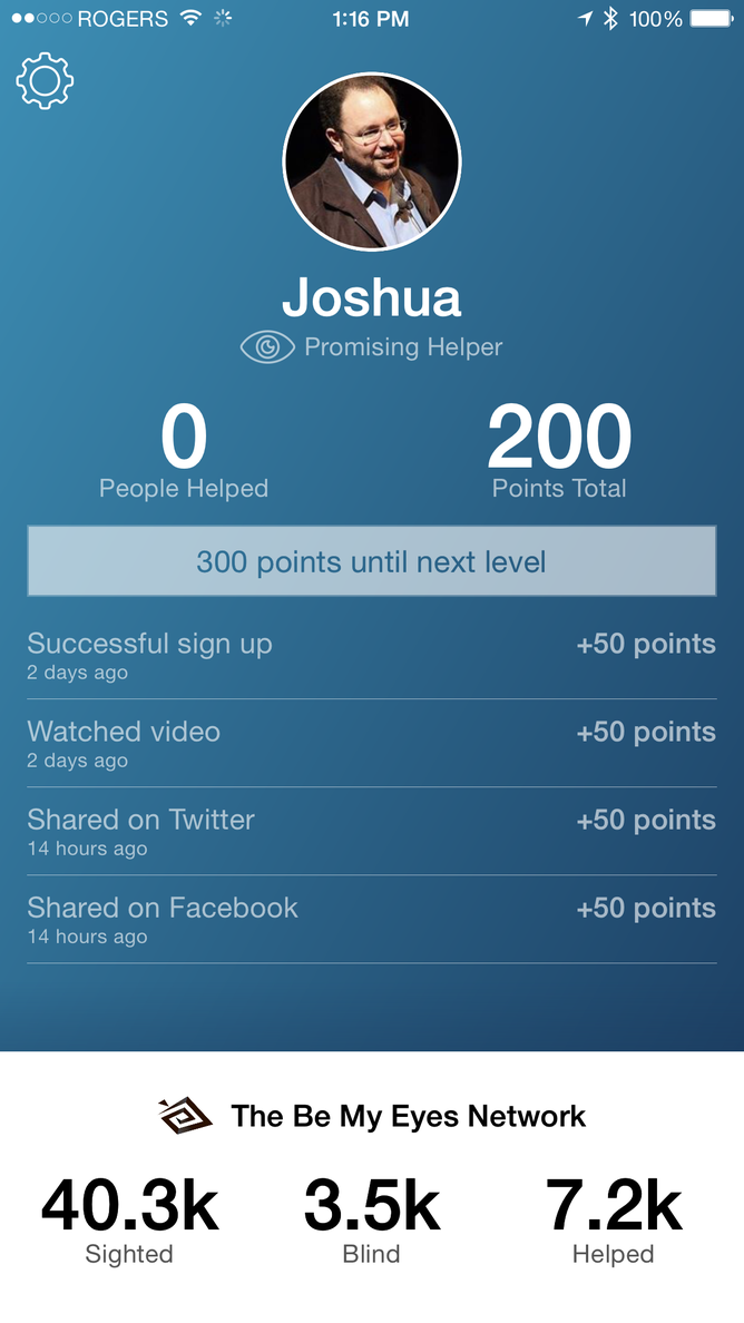 A couple of days later, my services still haven’t been required. But perhaps that is because 40,000 people are there to help the approximately 3,500 blind people on the service. Nonetheless, I was feeling good about the entire thing.