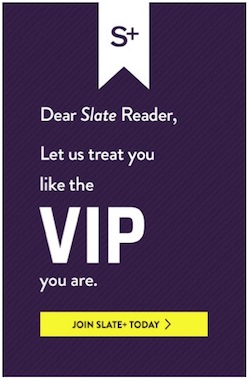 slate-plus-adEven though I am a regular reader of Slate, I missed this announcement last month that they are putting in a metered paywall for International (i.e., non-US) readers. Like many other news sites, you can have, in this case, 5 free articles a month and for more will have to pay $5 a month for access to everything. This is basically a new way of getting International readers to pay for its premium product, Slate Plus — that is, by the age old tradition of downgrading the quality of the free product. Fair enough, but why?