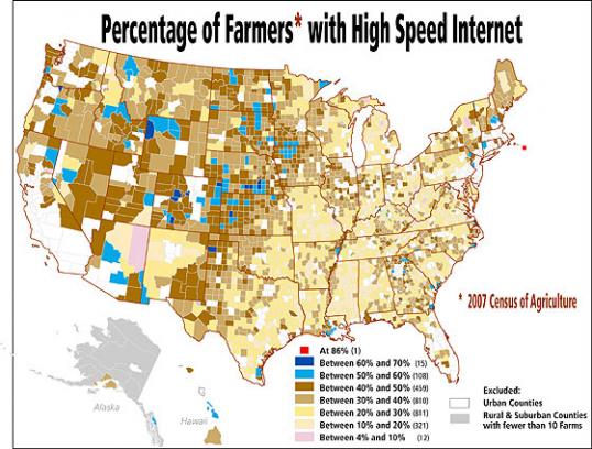 9. How big were the gains from serving low density areas? InternetMap farmsImprovements in Internet access led to gains in GDP in places that had limited access to retail outlets. Traditional price indices have an urban bias, because the information is easier to collect in urban stores. Rural America comprises the experience of 15% of the US population (45m people), and a much higher percentage (and number of people) in the developing world. Again, how big were the unmeasured gains? Were most of the gains realized in 1995, or has there been steady progress since as the Internet has gotten faster?